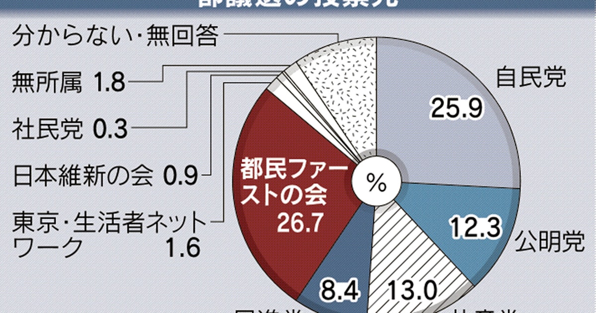 共同調査の数字は『都民ファーストの会が26.7%、自民党が25.9%、共産党13.0%、公明党12.3%、民進党8.4%、東京・生活者ネットワーク1.6%、日本維新の会0.9%、社民党0.3%、無所属1.8%』